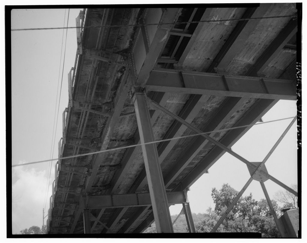 A new concrete deck replaced the original wearing surface in 1963, and a new sidewalk was constructed in 1970. 1 Deteriorated components, including diagonals, laterals, sway frames, the ends of stringers, and decking were replaced in 1985-88 to strengthen the bridge and extend its lifespan by ten years. By the 1990s, the Chelyan Bridge had only a 12-ton weight limit, down from 40 tons.